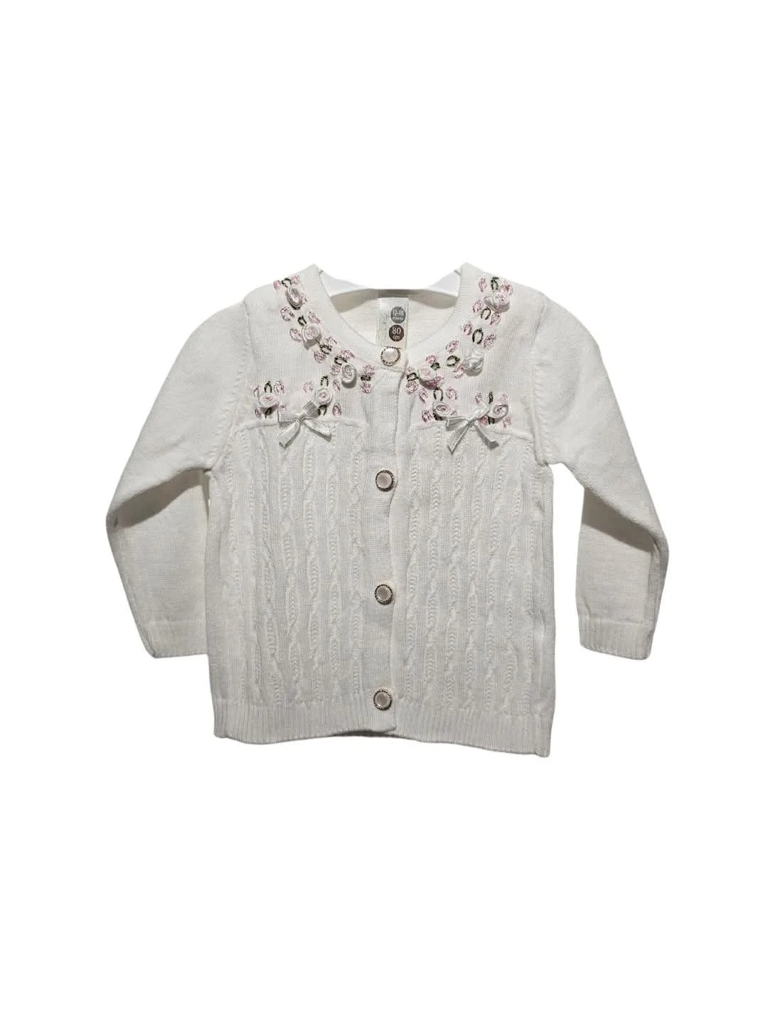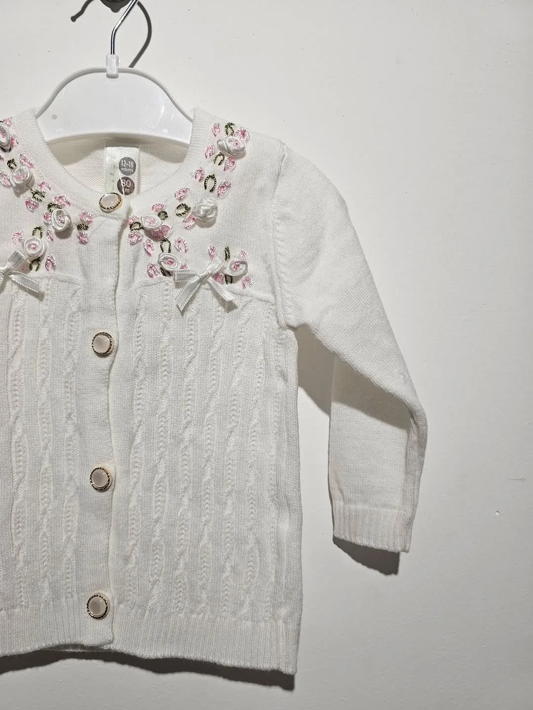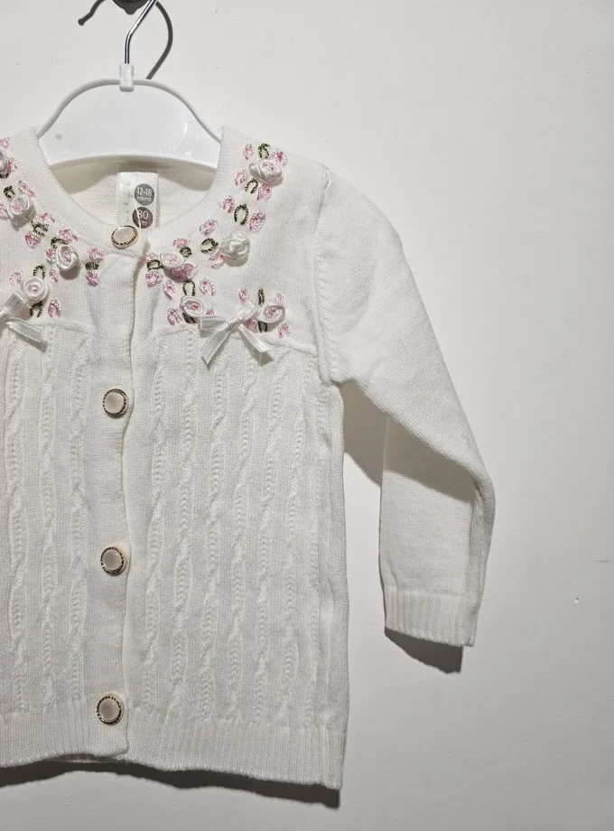 Πανέμορφη κομψή ζακετούλα με ιδιαίτερη πλέξη, κεντητά τριανταφυλλάκια και άλλες πανέμορφες λεπτομέρειες.