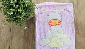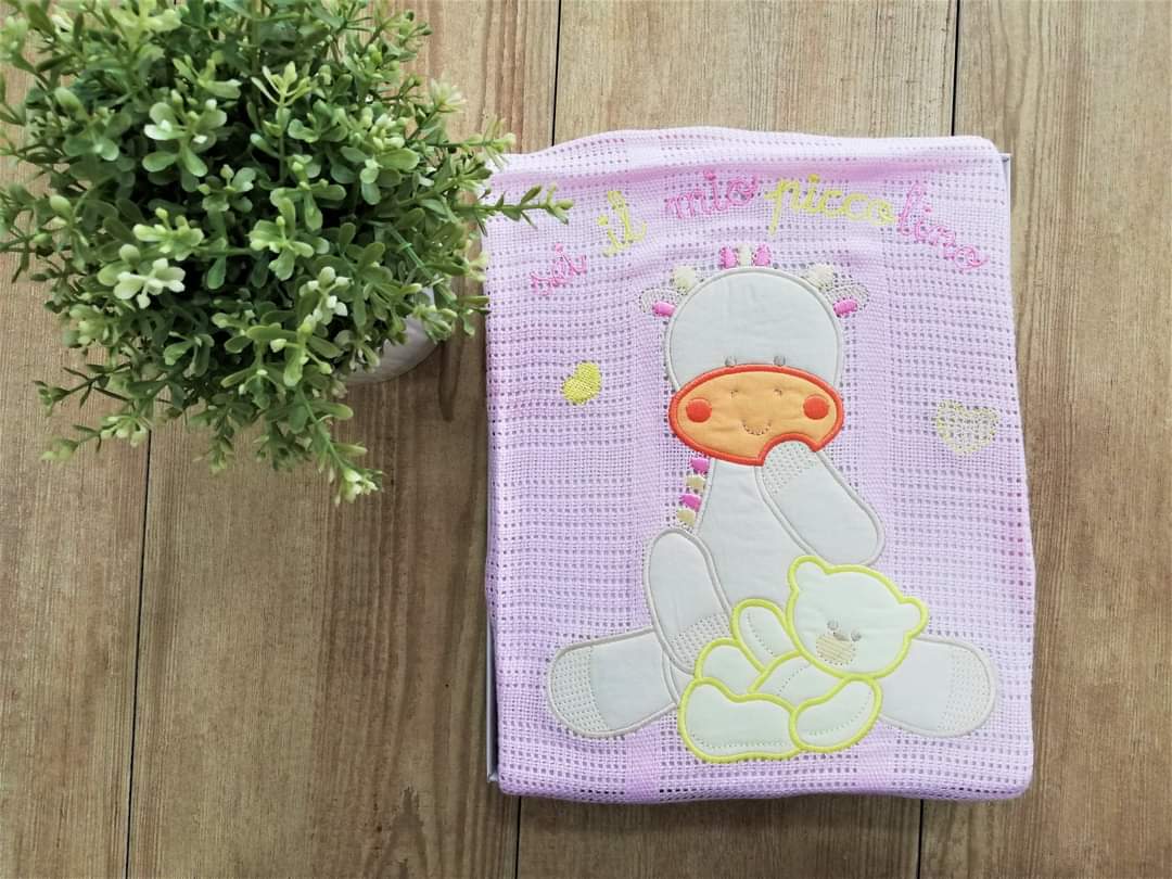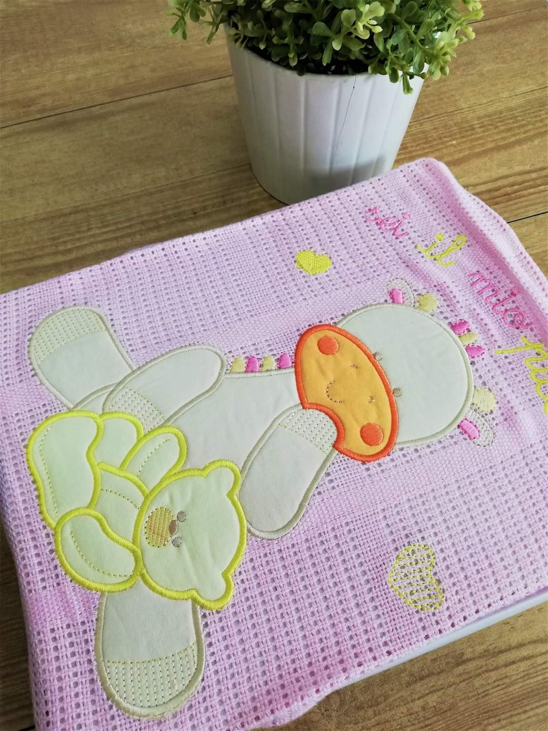 Υπέροχη κουβερτούλα για το βρεφικό κρεβατάκι, σε λεπτή πλεκτή ύφανση, με απλικέ κέντημα λεοπαρδαλίτσα με αρκουδάκι και καρδούλες. Είναι από την εξαιρετική ιταλική εταιρία Les Jolies, και είναι άριστη ποιοτικώς!