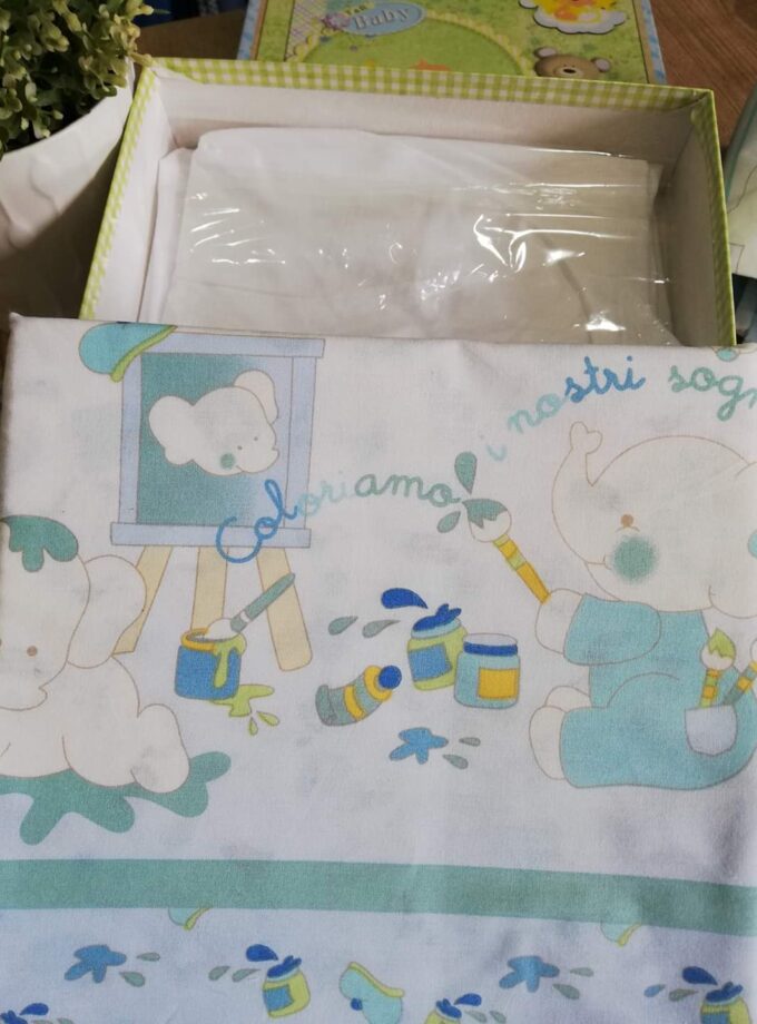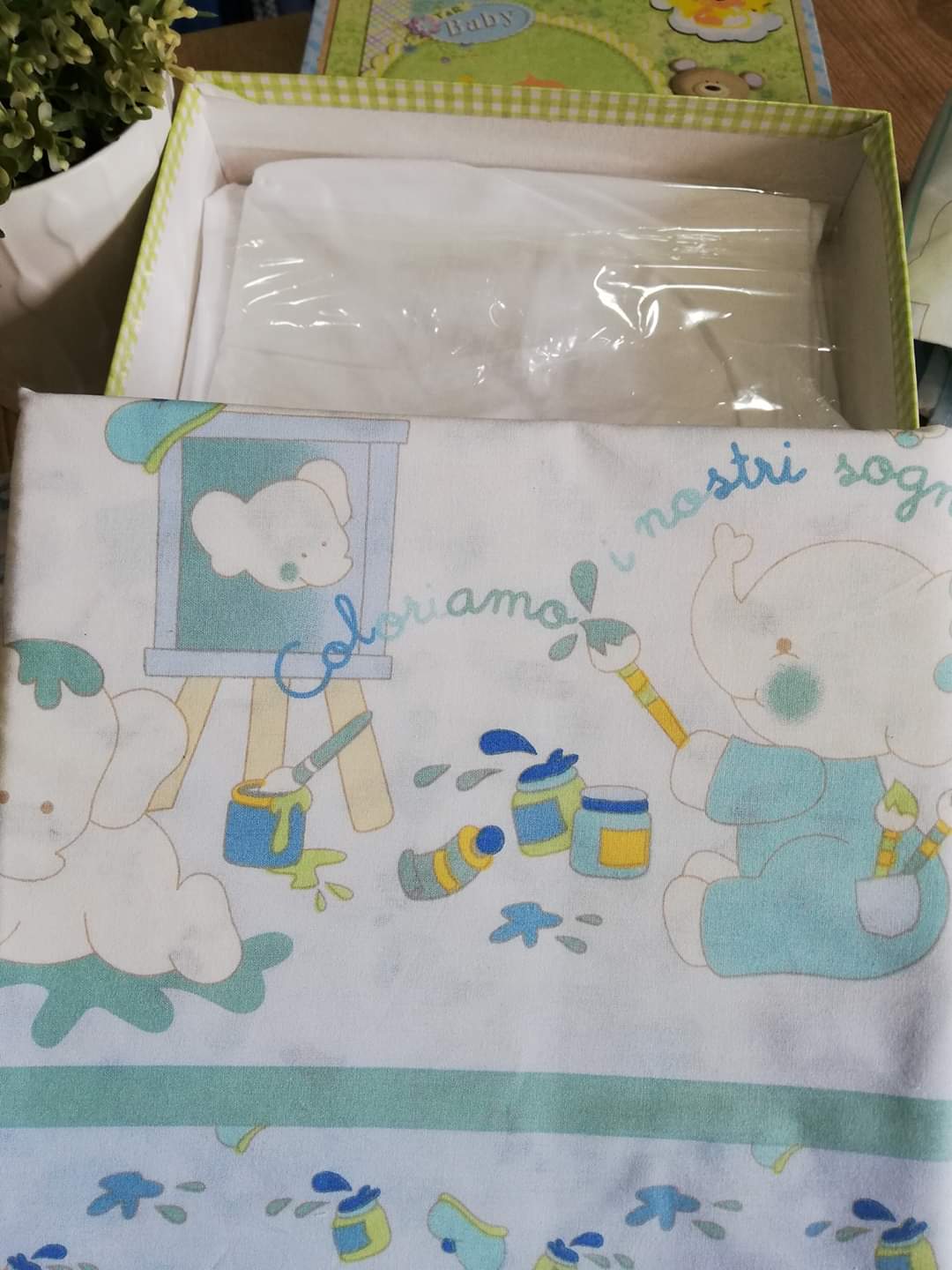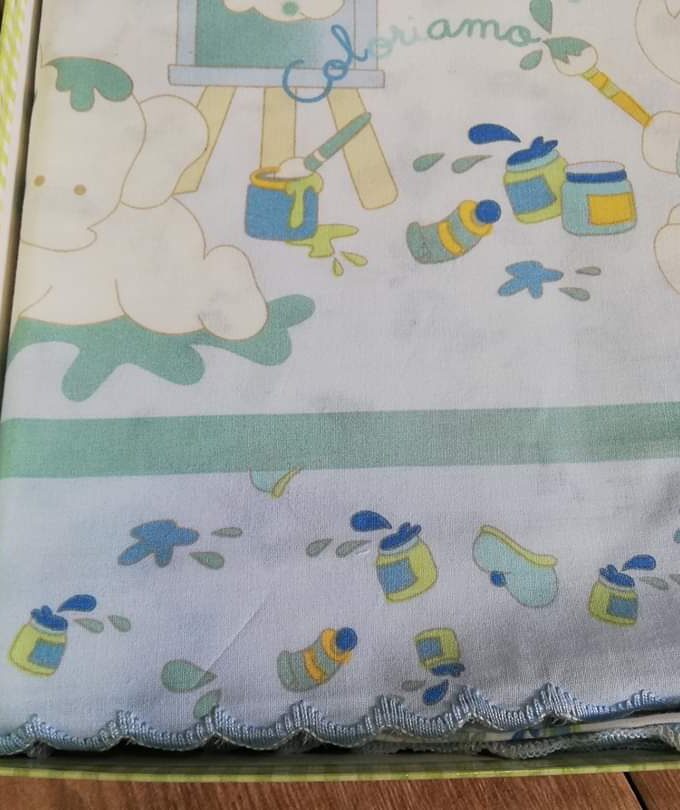 Σετ σεντόνια κρεβατιού. Το πανωσέντονο είναι σταμπωτό με ελεφαντάκια και τελείωμα κεντημένο σε χρώματα λευκό-σιέλ-πετρόλ. Το κατωσέντονο είναι λευκό με λαστιχάκι στις γωνίες και το μαξιλαράκι όλο τύπωμα.