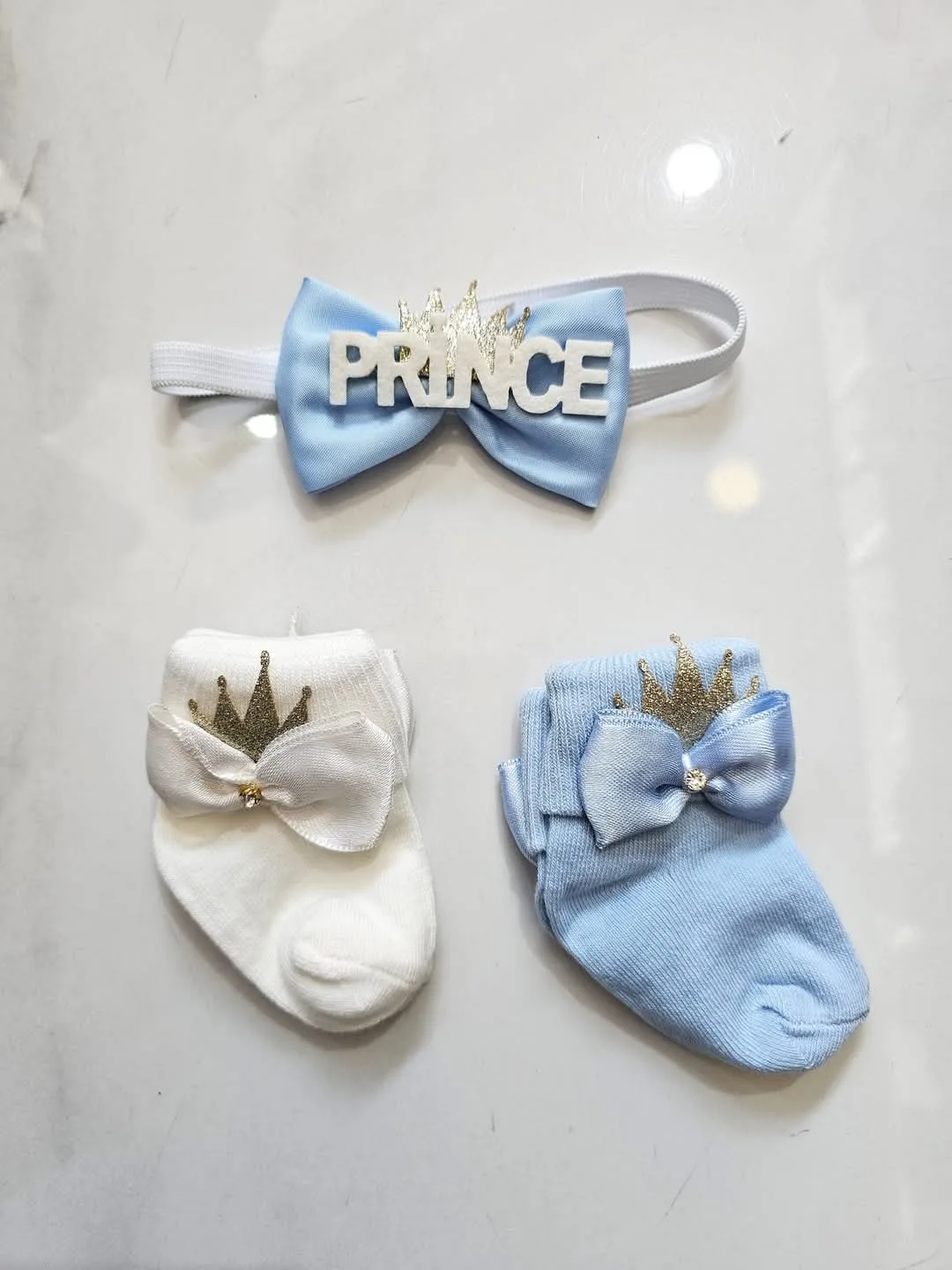 Τέλειο σετάκι για νεογέννητο μωράκι, με δύο καλτσάκια και παπιγιόν με σχέδιο.