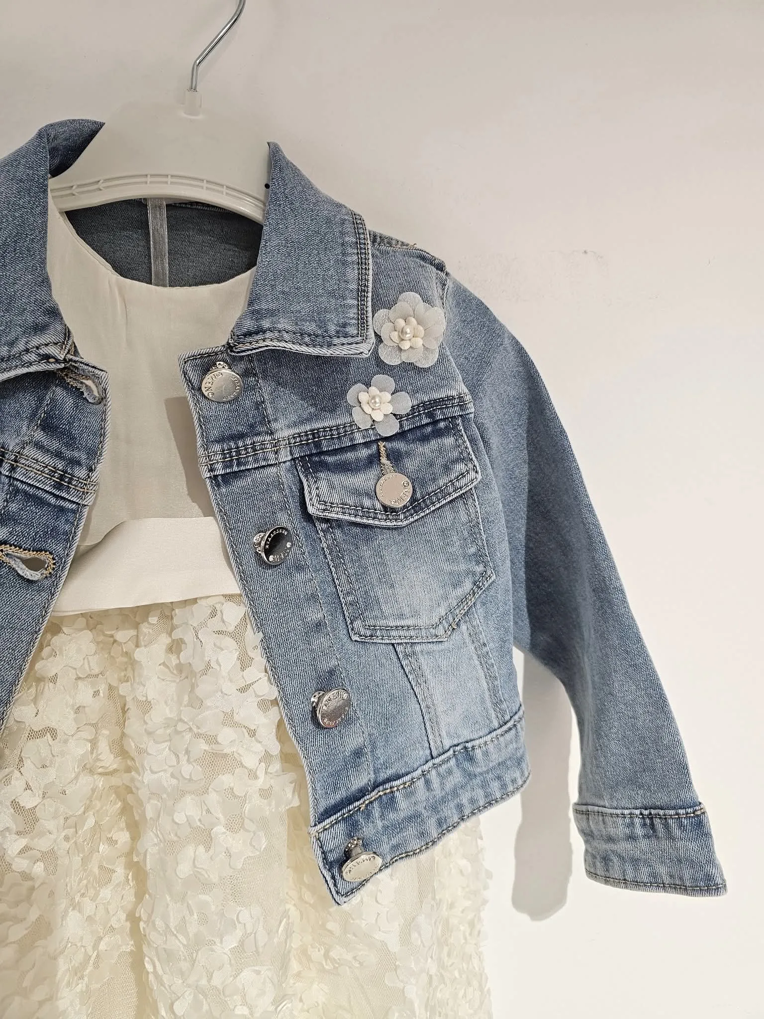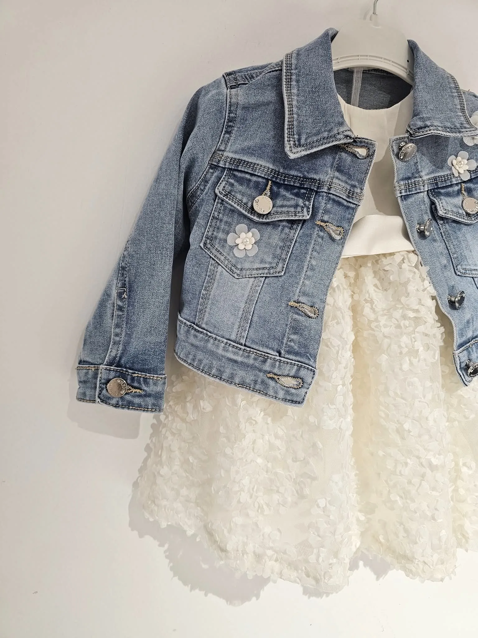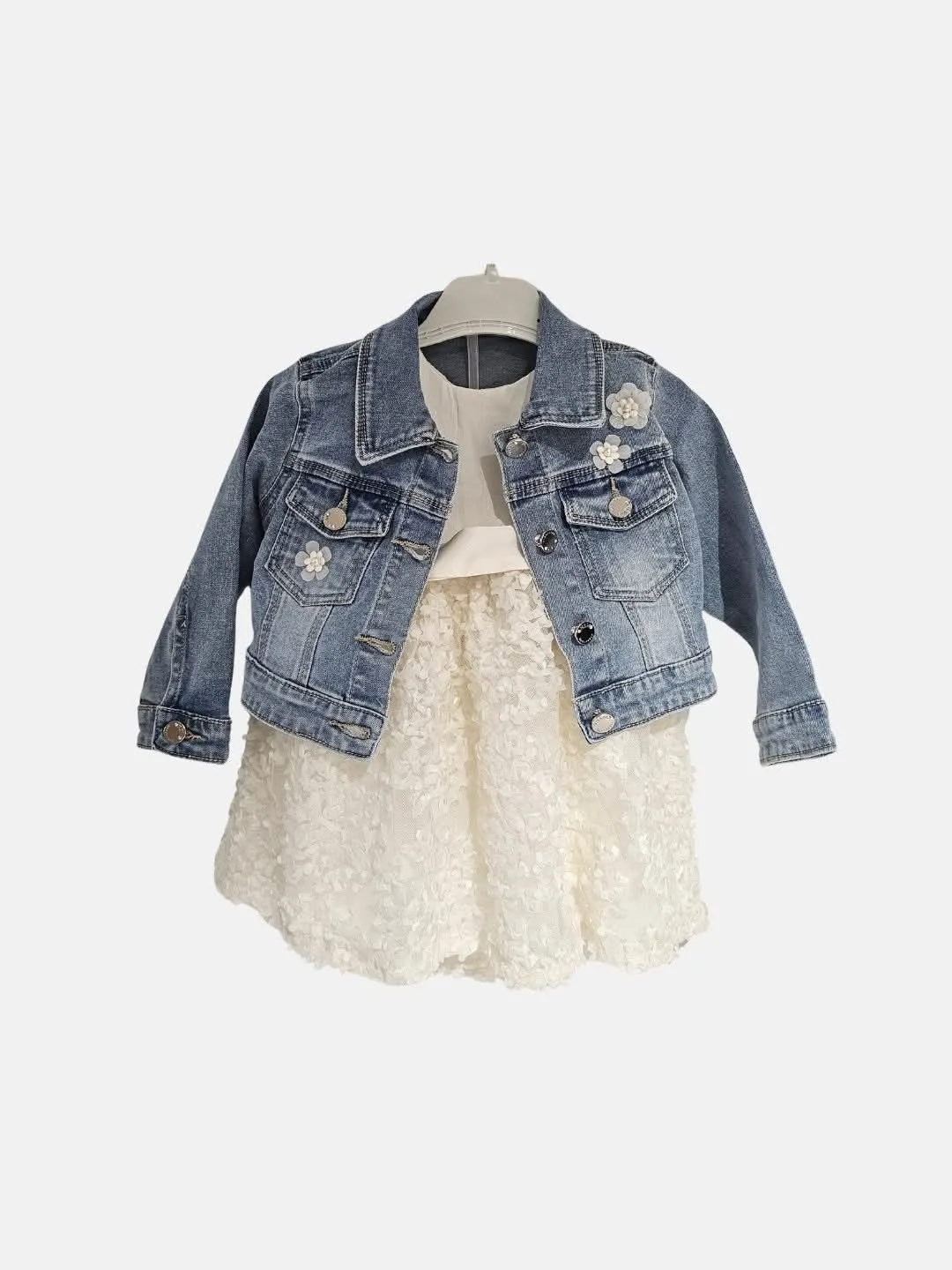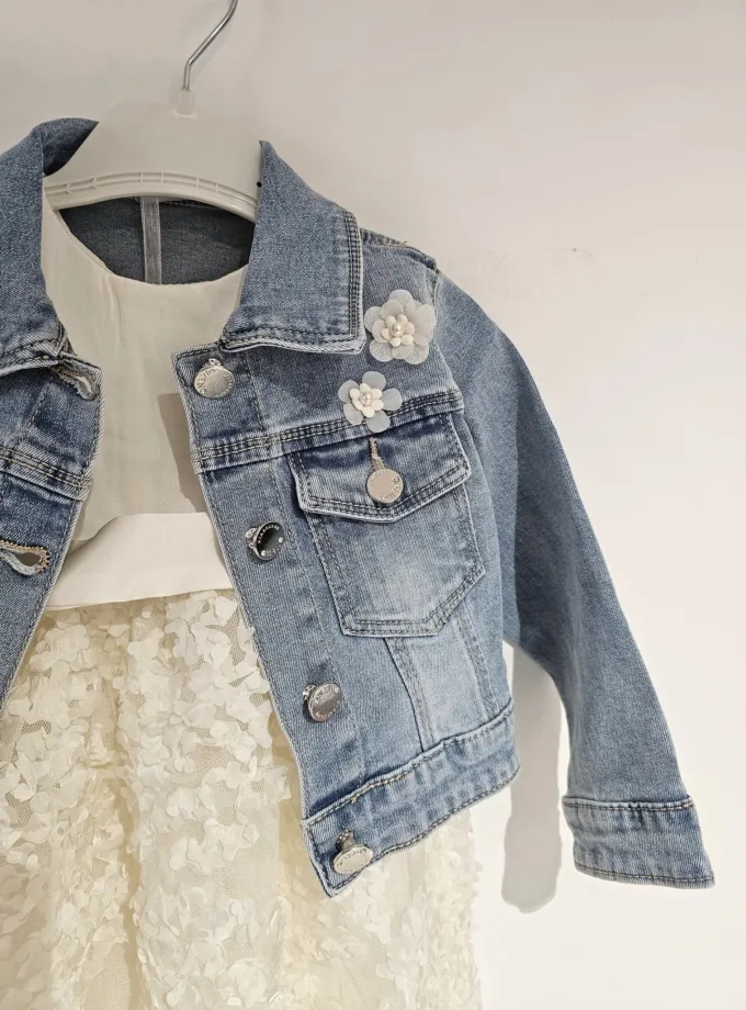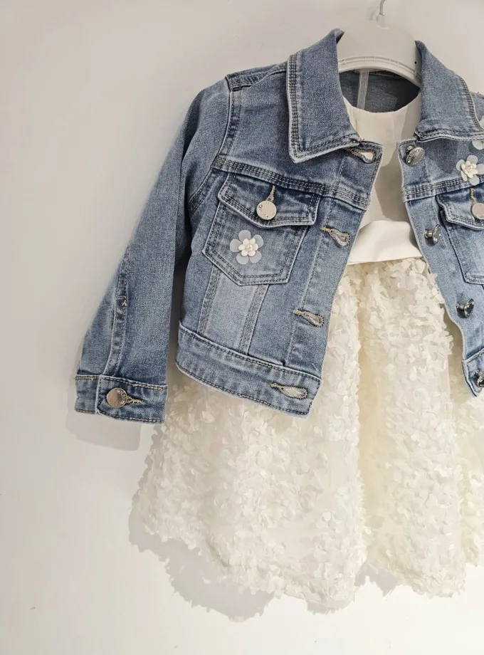 Υπέροχο συνολάκι με αμπιγέ φόρεμα και τζιν τζάκετ για την μικρούλα σας: