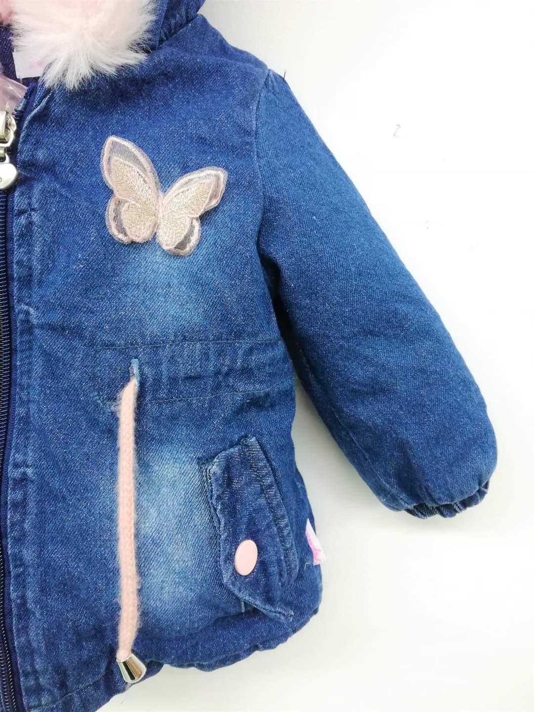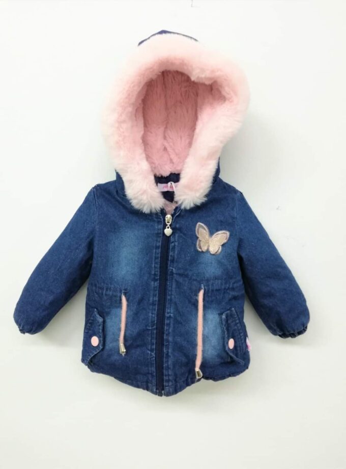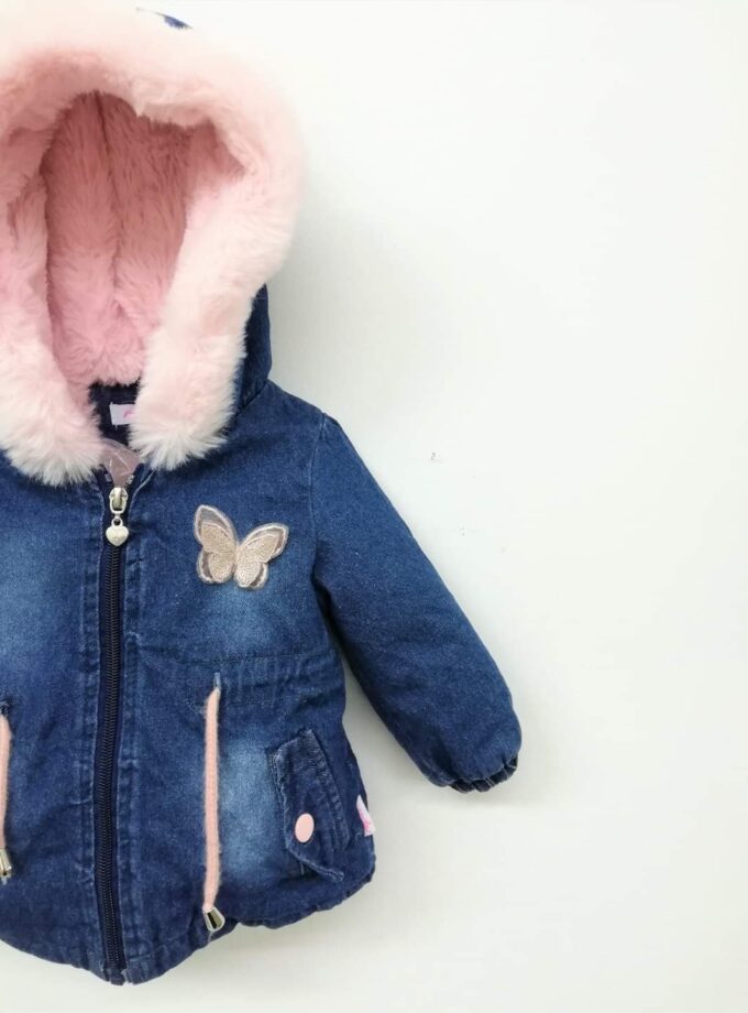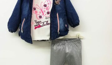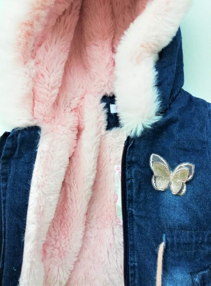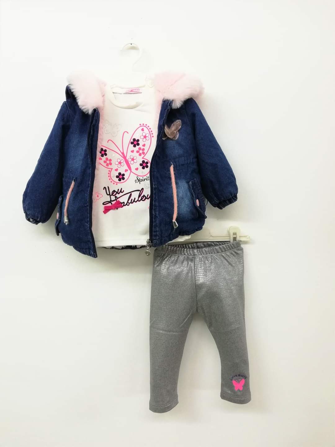 Σύνολο τριών τεμαχίων, με τζιν μπουφάν μακρύ και χοντρό, άσπρο μακρυμάνικο μπλουζάκι και κολανάκι ασημένιο. Το μπουφανάκι έχει γούνινη επένδυση, κουκούλα και τσεπούλες. Το μπλουζάκι έχει τύπωμα σε τέλεια χρώματα, φούξια και ασημί , που σχηματίζουν μια πεταλουδίτσα και το κολανάκι είναι ασημένιο με ένα απλικέ κέντημα και ύφασμα τύπου φίδι.