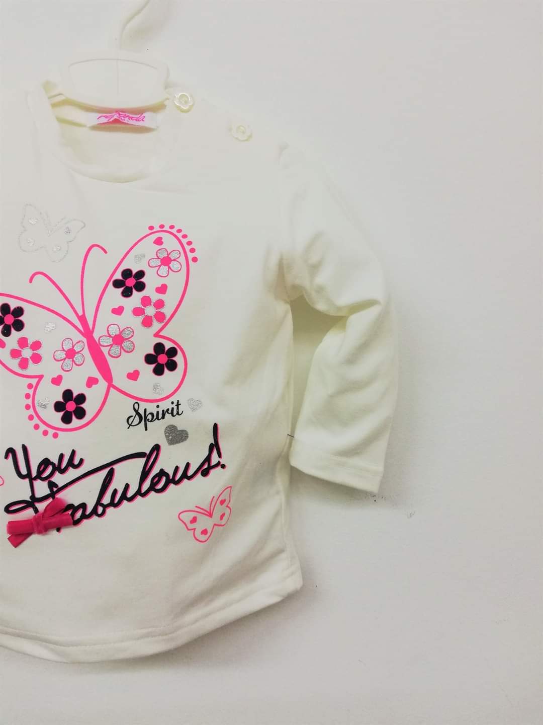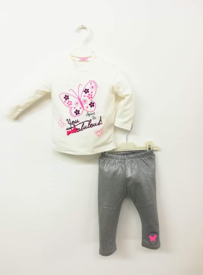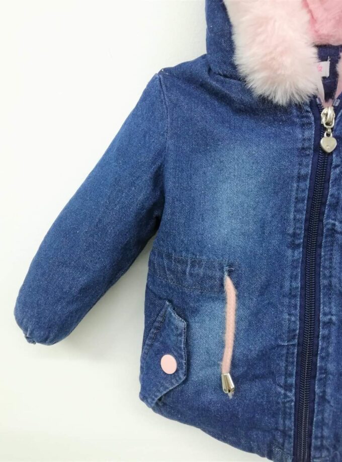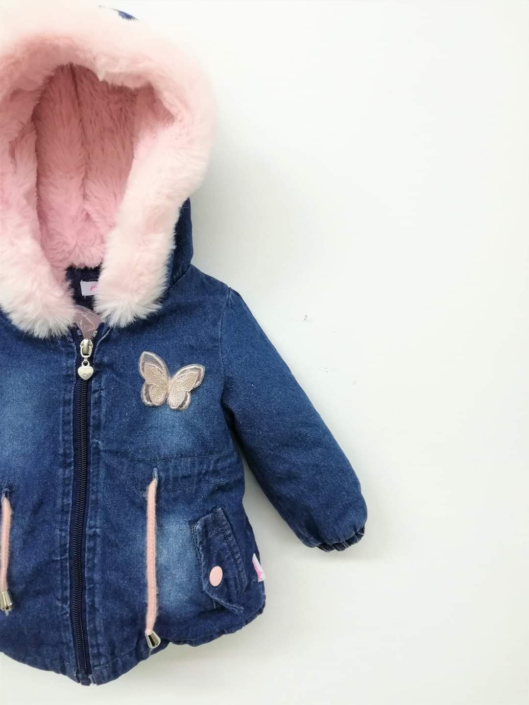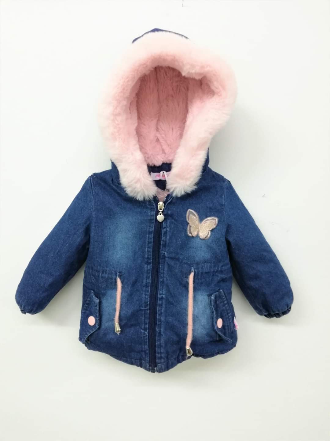 Σύνολο τριών τεμαχίων, με τζιν μπουφάν μακρύ και χοντρό, άσπρο μακρυμάνικο μπλουζάκι και κολανάκι ασημένιο. Το μπουφανάκι έχει γούνινη επένδυση, κουκούλα και τσεπούλες. Το μπλουζάκι έχει τύπωμα σε τέλεια χρώματα, φούξια και ασημί , που σχηματίζουν μια πεταλουδίτσα και το κολανάκι είναι ασημένιο με ένα απλικέ κέντημα και ύφασμα τύπου φίδι.