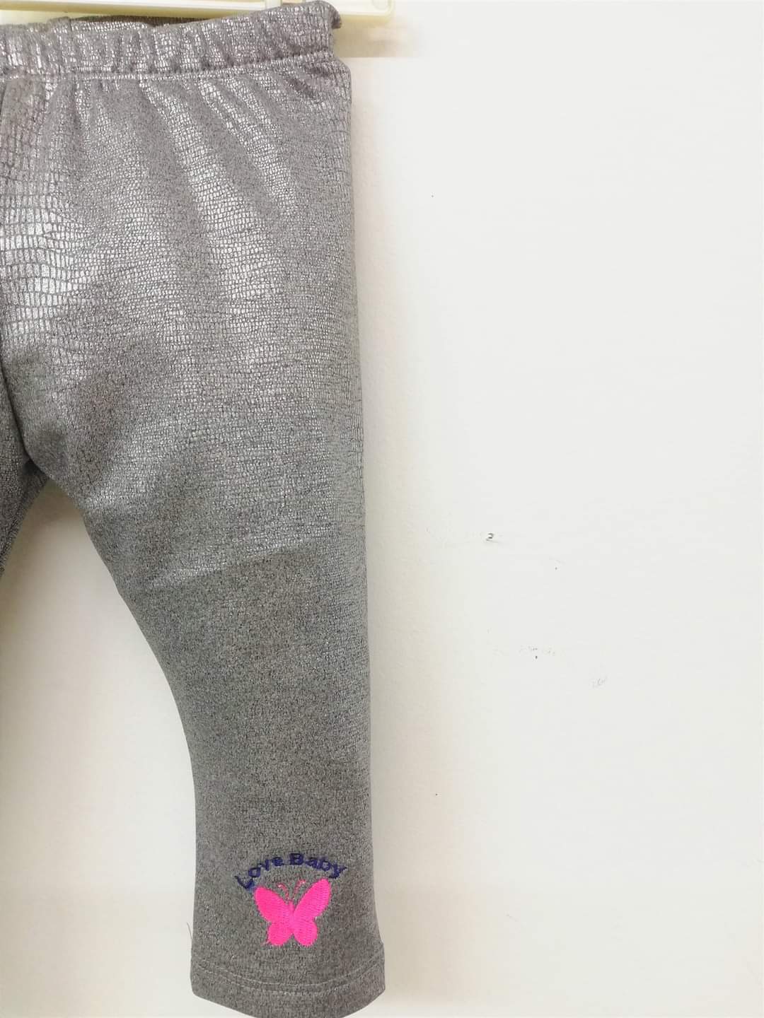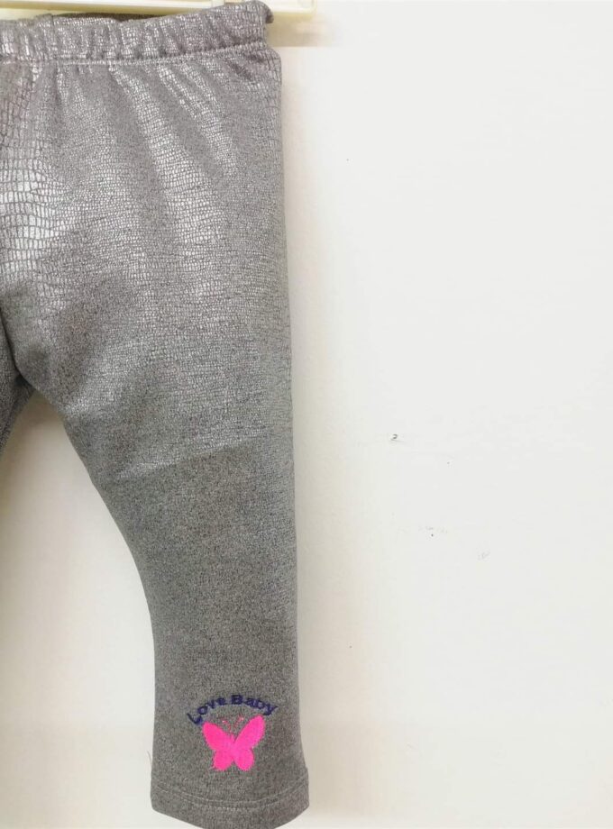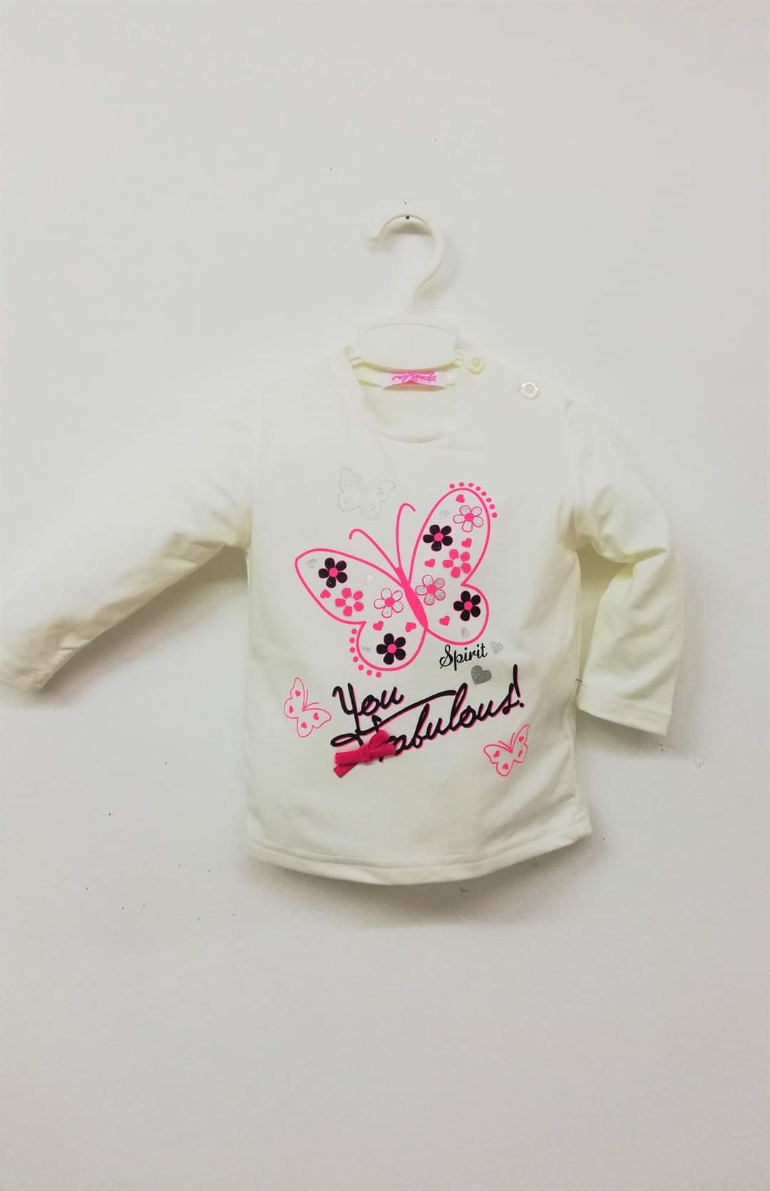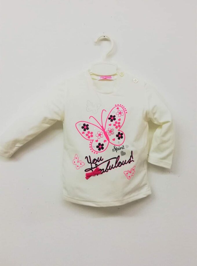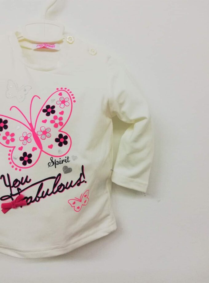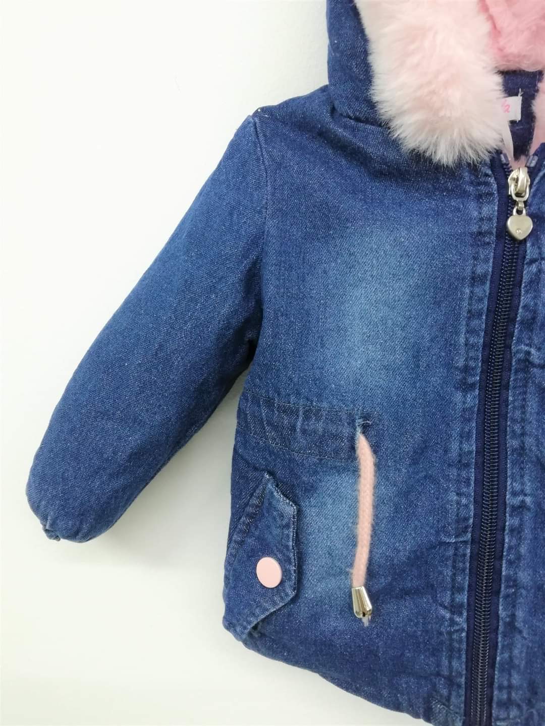 Σύνολο τριών τεμαχίων, με τζιν μπουφάν μακρύ και χοντρό, άσπρο μακρυμάνικο μπλουζάκι και κολανάκι ασημένιο. Το μπουφανάκι έχει γούνινη επένδυση, κουκούλα και τσεπούλες. Το μπλουζάκι έχει τύπωμα σε τέλεια χρώματα, φούξια και ασημί , που σχηματίζουν μια πεταλουδίτσα και το κολανάκι είναι ασημένιο με ένα απλικέ κέντημα και ύφασμα τύπου φίδι.