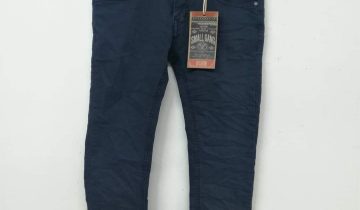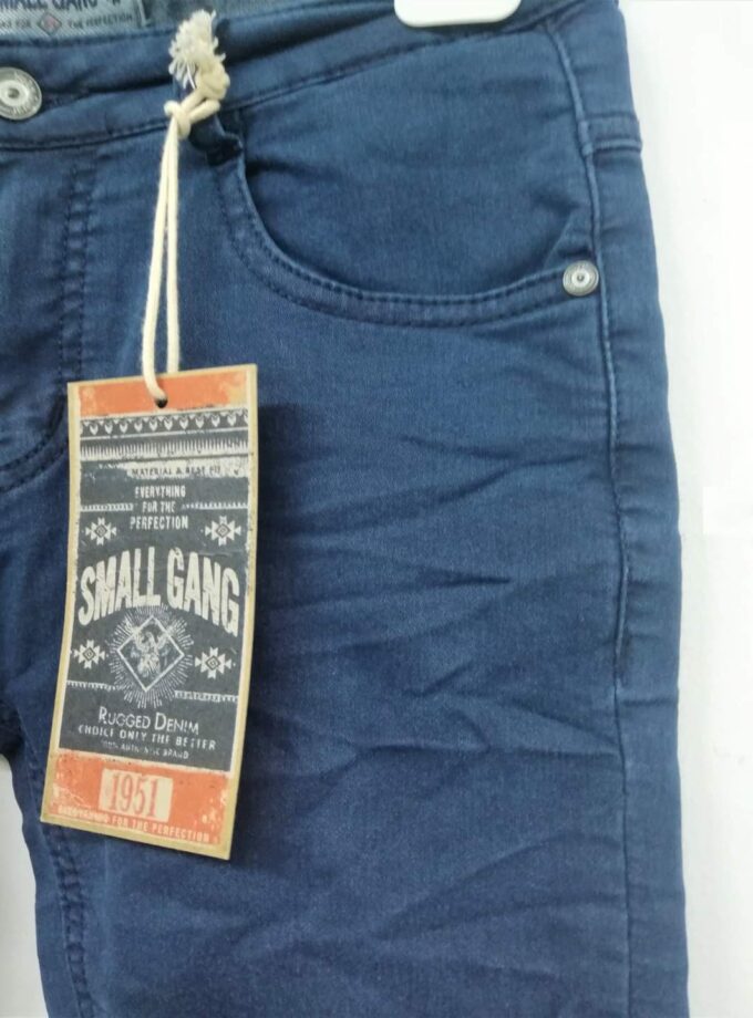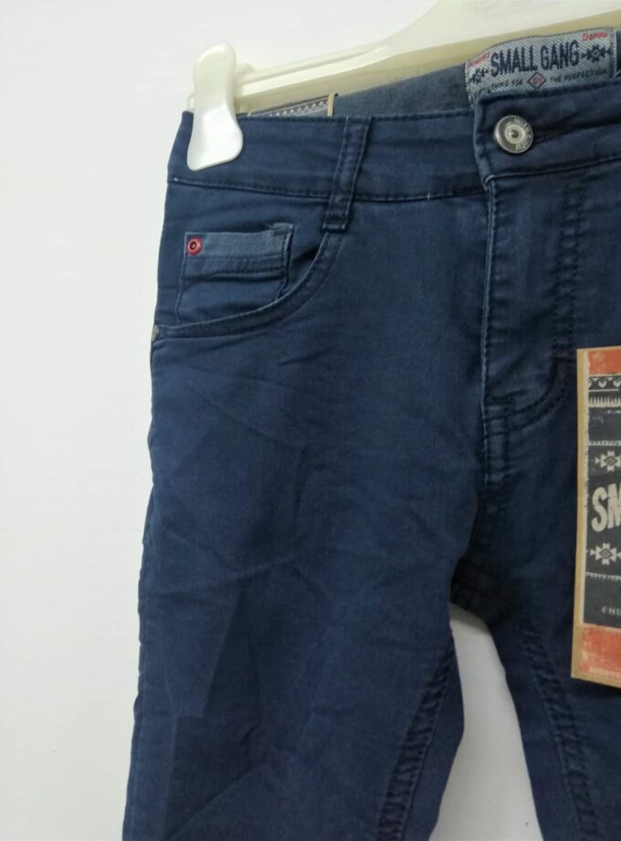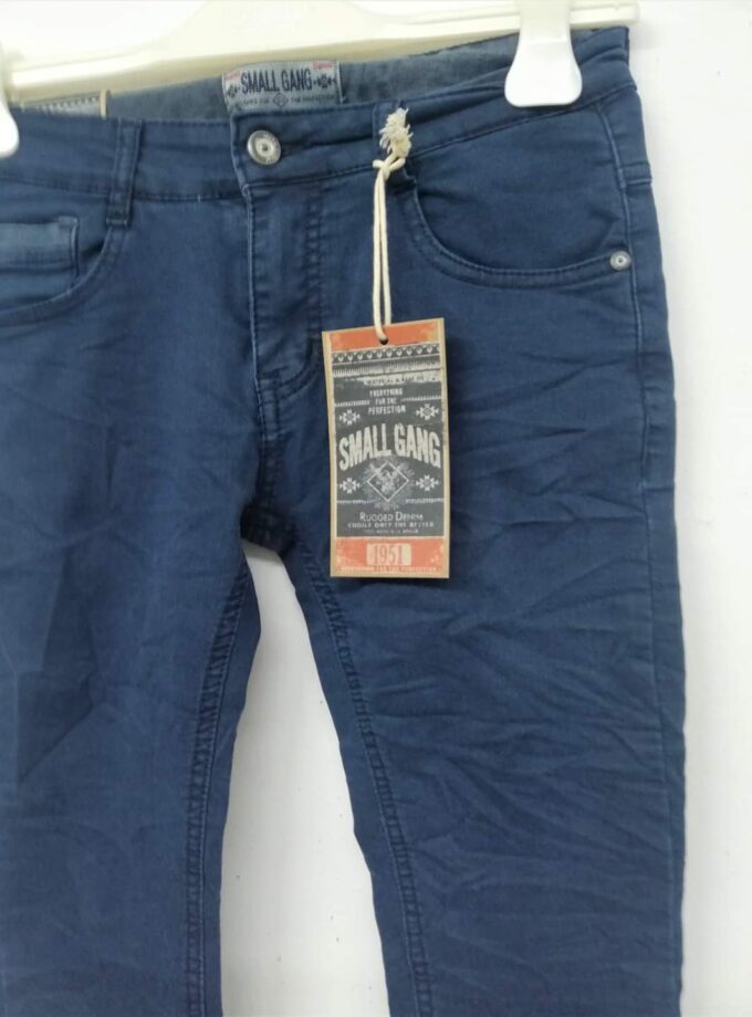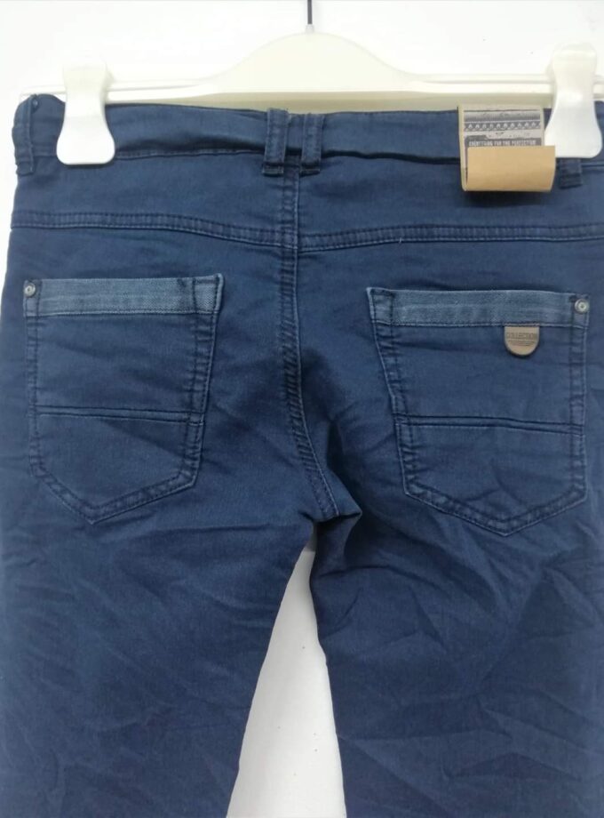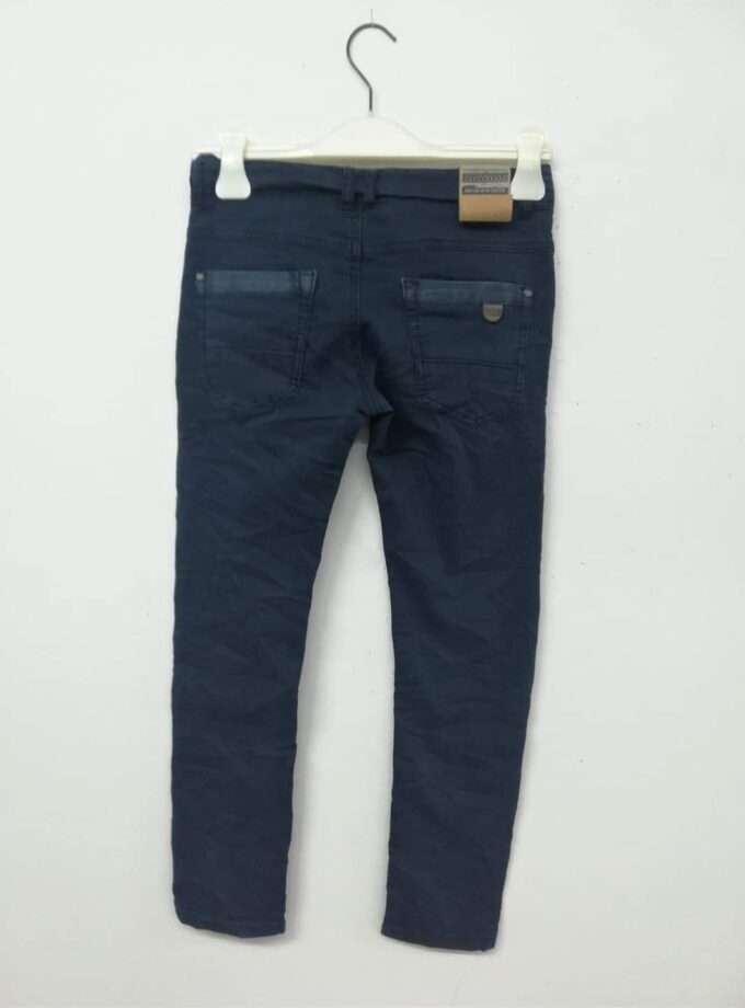 Ύφασμα μαλακό πολύ ελαστικό σε μπλε χρώμα ραμμένο σαν τζιν. Τσαλακωτό, με λάστιχο στη μέση για αυξομείωση.