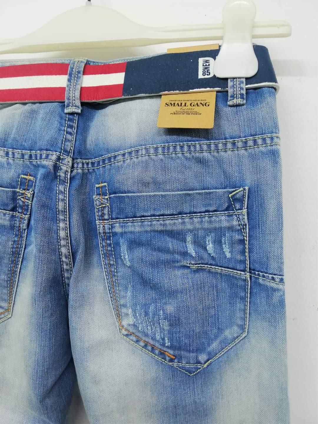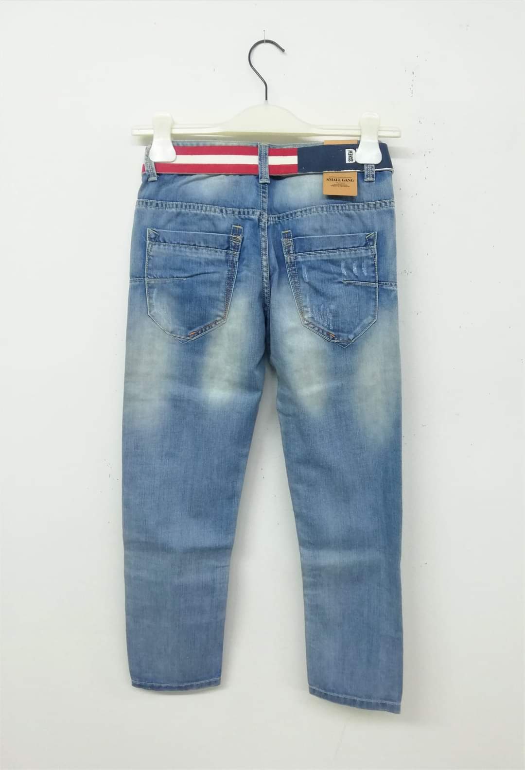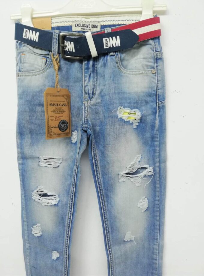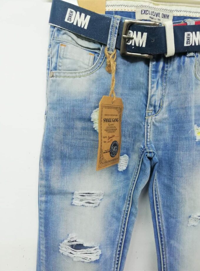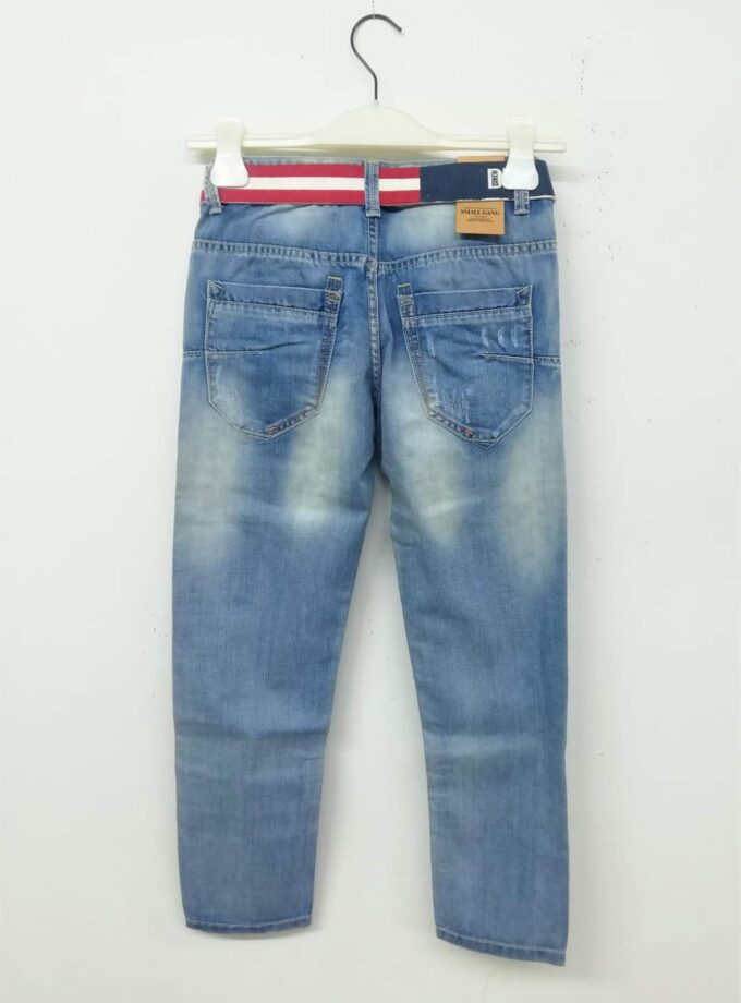 Καταπληκτικό τζιν παντελονάκι, ανοιχτόχρωμο, με γδαρσίματα και σκισίματα με φλούο φόδρα, και ζώνη μπλε και ασπροκόκκινη. Σε ίσια γραμμή, πολύ μαλακό και βολικό.