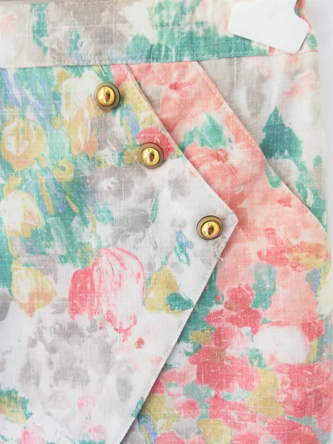 Φούστα σαν λινή, με υπέροχο τύπωμα σε παστέλ αποχρώσεις και ιδιαίτερο σχέδιο. Με φερμουαράκι πίσω και σκίσιμο.