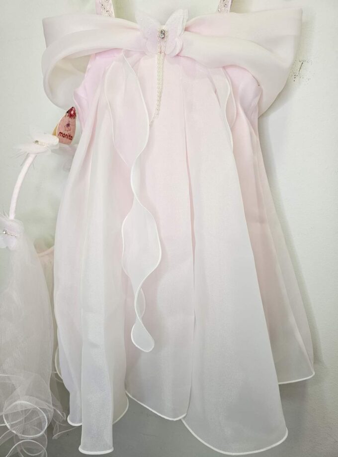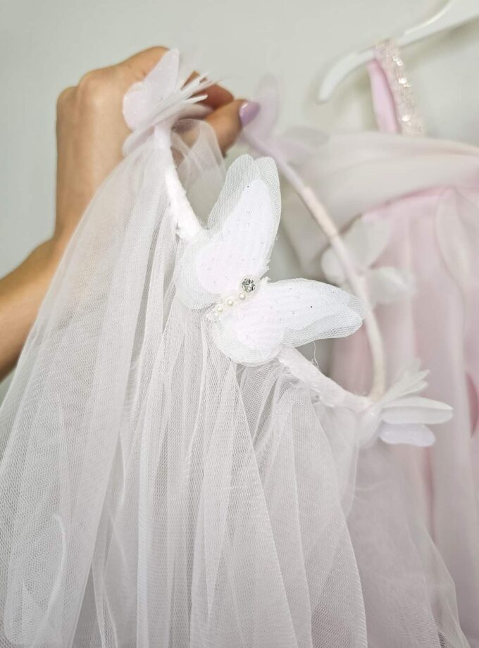 Συνοδεύεται από στεφάνι για τα μαλλιά με πεταλούδες και πέπλο, εξαιρετικό.