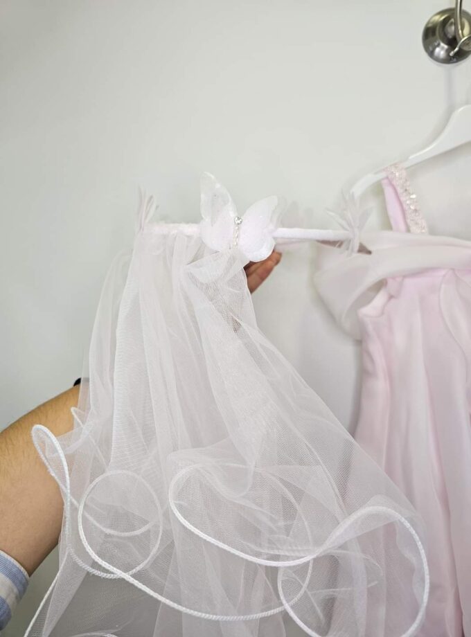 Συνοδεύεται από στεφάνι για τα μαλλιά με πεταλούδες και πέπλο, εξαιρετικό.