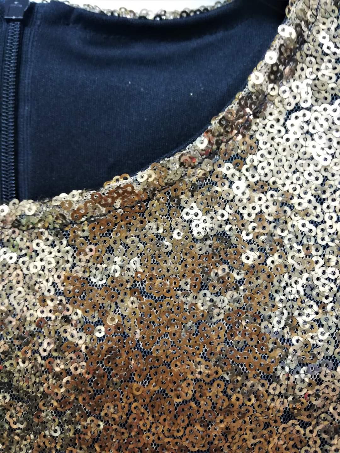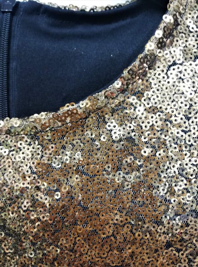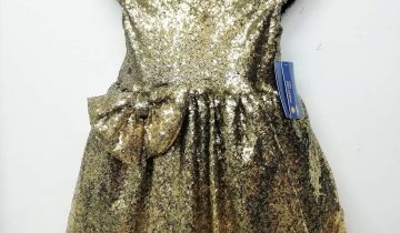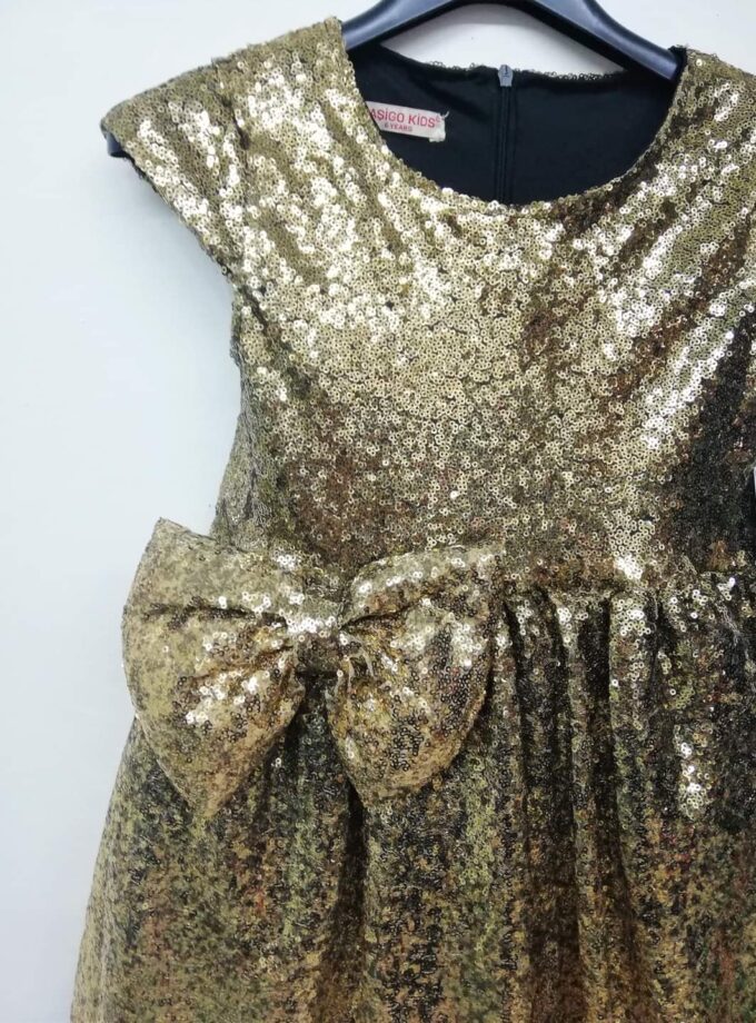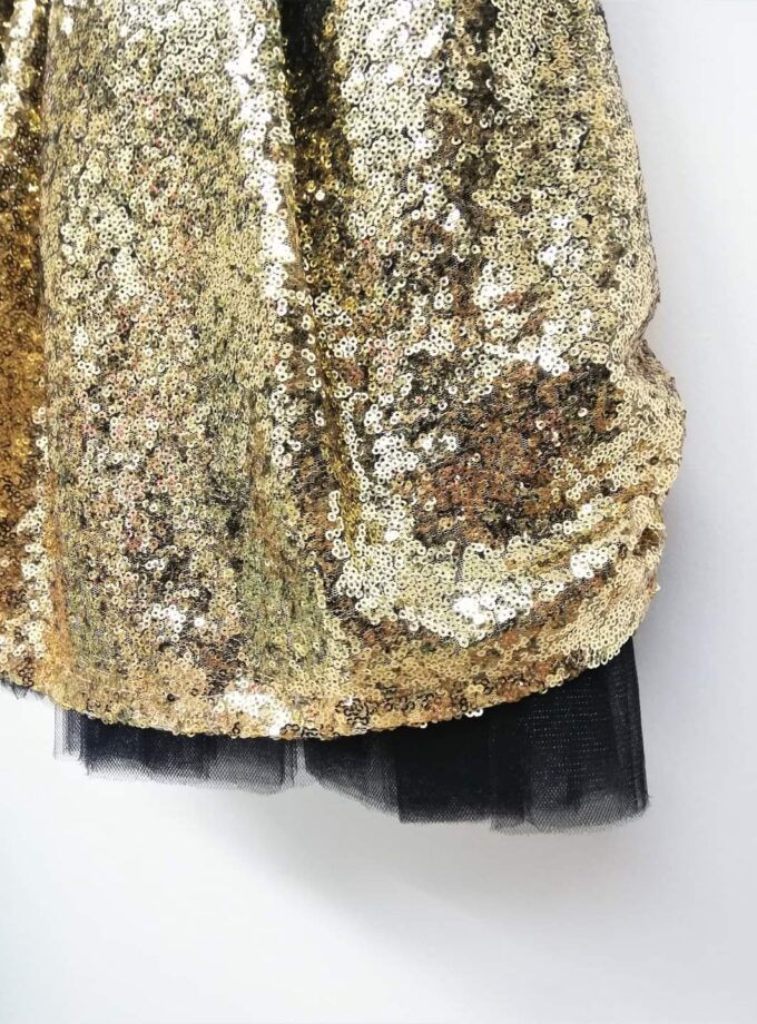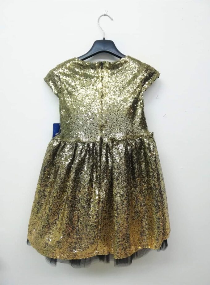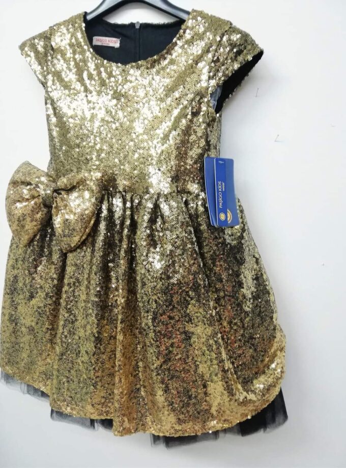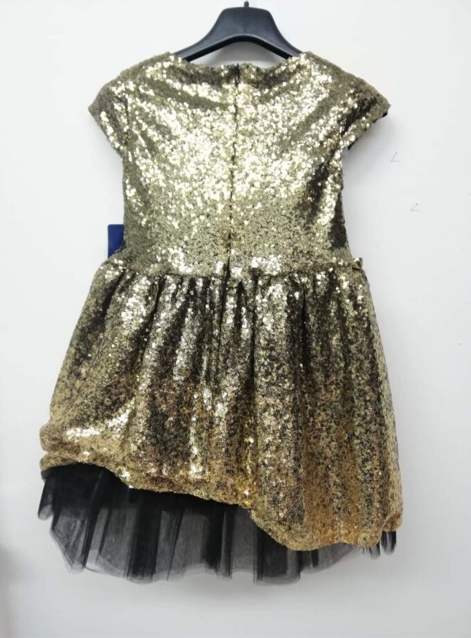 Φόρεμα όλο πούλια, με πλούσιο φουρό τούλινο από κάτω και επένδυση με ζέρσει φόδρα για να μην τσιμπάει πουθενά. Είναι σε χρυσό ντεγκραντέ, δηλαδή που αλλάζει κατεβαίνοντας, τόνο και έχει εντυπωσιακό αποσπώμενο φιόγκο που μπορεί να μπει όπου θέλει. Σε πλούσια και άνετη γραμμή.